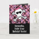 O cartão de aniversário preto e rosa, divertido e quadril, apresenta um crânio e ossos cruzados com um arco rosa no topo da cabeça, e corações para os soquetes oculares. Perfeito para a adolescente ou pré-adolescente que gosta de emo grunge, ou para celebrar seu aniversário especial. Fundo de xadrez rosa-quente e engraçado com placas pretas de tinta. Personalize-o com seu próprio nome ou texto para esse toque especial adicionado. Este design está disponível como uma coleção completa que inclui roupa, material, acessórios, presentes exclusivos e muito mais!