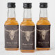 Etiquetas de garrafa de licor miniatura para recepção de casamento country western com crânio de touro rústico. Favor personalizado em estilo fazenda marrom para convidados. Textura vintage antiga inspirada no velho oeste selvagem. Design moderno e tendência de animais de fazenda. Personalize sua tipografia. Direitos autorais da imagem Marg Seregelyi Photography.