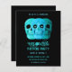 Esta engraçada cabeça de crânio Gótica, azul, criativa negra, Festa de aniversário de Halloween, convite para meninos, mostra um design de três crânios com olhos paternais. Vintagem moderna, legal, única, assustadora, assustadora, inspirada na moda. Imagem copyright Marg Seregelyi Fotografia.