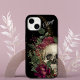 Um crânio de cinza realista é rodeado por um buquê floral vermelho farrado com um confete brilhante de ouro nesta capa de telefone. Acima da imagem está o texto personalizado em cinzas prateadas. Se preferir remover o nome, basta limpar o campo de texto.