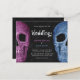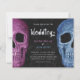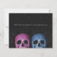 Cabeça de crânio gótica, cor-de-rosa, azul e preto, convite de cartão plano do orçamento de casamento do Halloween. Divertido, assustador Hallowding. Até a morte nos faz um guião em impressão de textura. Imagem copyright Marg Seregelyi Fotografia.