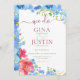 Este design inclui um buquê que flui de cor-de-rosa-escuro, pêssego e cravos amarelos e azul esqueça-me dos pontos. Simples e doce, esta design é perfeita para casamentos informais a semissformais. Este cartão faz parte do conjunto de cartas "Carnação e esqueçam-me", criado pela imprensa "Simply Farmhouse".