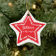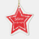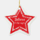 O ornamento da árvore de Natal é mostrado em forma de estrela em vermelho e branco com estrela e acredite em impressão. Personalize este item ou comprar como está.