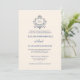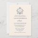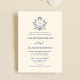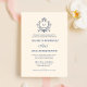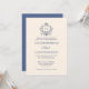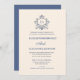 o design mostra um convite de casamento escrito em clássico caligrafia azul empoeirada e tipografia junto com uma crista floral no topo. este design é absolutamente único, clássico, elegante, moderno e será perfeito para o seu casamento.