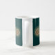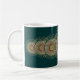 Caneca de café decorada com o design do "crescimento". O design é cercado com um fundo azul esverdeado e aparado com uma beira verde escuro.