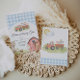 Adorável convite de aniversário com tema de fazenda, que inclui animais de exploração, um celeiro e impressão de gingham azul.