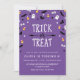 Convites de aniversário roxos e bonitos com sanduíche com confete de fantasmas, globos oculares, milho doce, morcegos e calçados e vassouras de bruxas. O truque ou o tratado de tipografia escrita à mão está rodeado pelo confetti; abaixo está o texto personalizado do convite de festas. Plano de fundo ligeiramente texturizado - você pode até mesmo alterar a cor de fundo usando a ferramenta Personalizar/Personalizar. Perfeito como convites para festas de halloween também!