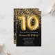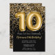 Convite de aniversário elegante preto e ouro 10º para uma menina de 10 anos com roteiro elegante escrevendo design de fonte dourada e balões de folha divertida.