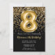 Convite de aniversário preto elegante e dourado 8º para uma menina de 8 anos com script elegante escrevendo design de fonte dourada e balões de folha divertida.