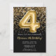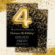 Elegante convite de festas de 4 anos preto e dourado para uma menina de 4 anos com roteiro elegante escrevendo design de fonte dourada e balões de folha divertida.