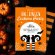 Convite de festas de fantasia de Halloween com aranhas balançando penduradas de pés de bruxas. O texto está cercado por estrelas, aranhas e um morcego. A parte traseira apresenta faixas correspondentes em preto e laranja.