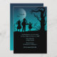 Um novo design de Halloween com a silhueta de três crianças fantasiadas debaixo de uma lua de colheita.