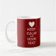 Criar sua própria versão pessoal do ícone do coração do "mantêm a calma e continuam" o poster em uma caneca! Esta versão tem uma obscuridade afligida - fundo vermelho. Vá adiante e encha seu próprio texto nas caixas fornecidas, e sinta-o livre personalizar como desejado. Excelente para isso especial alguém em sua vida! Tenha o divertimento e aprecie-o!