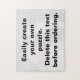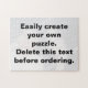 Crie facilmente seu próprio quebra-cabeça com sua foto. Altere a imagem com a sua própria fotografia e clique em Personalizar para redimensionar a imagem e escolher o tamanho e a cor da fonte e tornar o seu quebra-cabeça exclusivo. Não se esqueça de excluir o texto grande antes de fazer o pedido. Orientação horizontal, mas você pode facilmente torná-la vertical.
