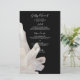 Personalize o elegante menu White Crystals no Black Wedding com os detalhes da refeição que você servirá no almoço de chá de panela, poste o brunch de casamento ou o janto de recepção de casamento, adicionando a salada ou o primeiro curso, a entrada ou o segundo curso e a sobremesa ou o terceiro curso. Personalize-o com os nomes da noiva e noiva, local de evento e data. Este clássico e personalizado menu de casamento do tema etéreo chakra apresenta uma fotografia de perto de uma amostra de geode mineral druz de quartzo branco com fundo negro. O quartzo claro também é conhecido como o "curandeiro-mestre" e "pedra do poder" e é dito que aumenta qualquer energia ou intenção e faz um aprimoramento ou adição únicos à sua decoração ou tema de casamento.