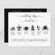 Elegante programa de cronologia do casamento preto e branco moderno com belas imagens de ícones da linha do tempo em preto, branco, cinzas e matizes esticadas e elegantes detalhes caligraficos modernos e manuscritos. Capacidade de selecionar personalizar e mover ao redor de imagens e texto da linha do tempo para adequar-se à sua própria linha do tempo do casamento, simplesmente arraste e mova-se. Personalize a imagem de janto com suas próprias iniciais. Voltar em preto "cor de fundo" (que pode ser alterada para qualquer outra cor que você quiser selecionando "personalizar mais") e texto branco com a capacidade de personalizar as informações de volta para adicionar o programa de casamento e os nomes de festas de casamento ou qualquer outra informação que você quiser.