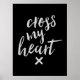 Poster inspiracional exibindo a frase "Cross My Heart" em um script de pincel branco com uma textura de tinta orgânica para alcançar um visual autêntico, com letra de mão. Projetado para olhar o excelente em todos os tamanhos de poster orientados a retratos. Verifique se a imagem precisa ser reposicionada ou redimensionada após alterar o tamanho do poster.