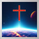 Cruz vermelha e dourada perto da fuga espacial dos planetas. Criado com o uso do software AI.