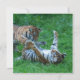 Dois filhotes de tigre divertidos aproveitam um momento divertido na grama. Um filhote está no chão com as patas esticadas, quase como se estivesse pronto para um abraço, enquanto o outro se envolve brincalhão. A sua energia juvenil e curiosidade natural fazem disto uma vista animadora.