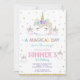 Whimsical Rainbow Unicorn Birthday Cake Invitation, com um adorável bolo de unicórnio, cupcakes de unicórnio, rosquinhas e uma manchete "um dia mágico está a caminho". Um incrível cupcakes de unicórnio arco-íris e rosquinhas de unicórnio na parte de trás do convite. Projetado com amor pelo Happy Cat Studio. (c) Happy Cat Studio - Todos os direitos reservados.