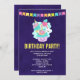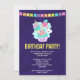 Convite de aniversário com uma ilustração fofinha com um cupcake e sorvete sorrindo de alegria. Um arco-íris e corações rodeiam o desenho. Uma nuvem fofa e fofa também está sorrindo de felicidade. O cupcake e o sorvete também têm um trompa de unicórnio em cima. Uma ilustração colorida de banner de bunting se estende pela parte superior. Cheio bonito e adorável de alegria.