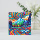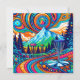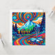 Arte representando um curso colorido de discos nas montanhas e pinheiros em azul, laranja e verde.
