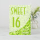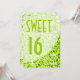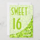 Convite com um design moderno com estrelas espalhadas por uma forma estilizada de "aparência sequencial" curvada em tons de verde limão com 'Doce 16' 'Você é convidado' escrito em verde e branco. Pode ser usado como um fundo para o seu próprio texto, imagens e ideias. O texto pode ser facilmente alterado usando o modelo fornecido ou clique no botão 'Personalizar o texto' para fazer outras alterações. Observe que esta é uma imagem de arte digital impressa, ela não brilha ou contém cinzas ou sequências reais.