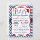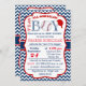 Este é um convite bonito do chá de fraldas que caracterize um design azul e branco da viga com a informação do chá em um quadro esboçado no vermelho. Você pode personalizar o convite incluir o nome, a data e o lugar do chá. Mude o tamanho, a cor e o estilo de pia batismal para serir suas preferências.