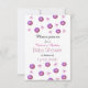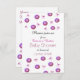 Um design bonitinho com botões roxos e pequenos arcos cor-de-rosa sobre fundo branco. Um convite de chá de fraldas 'fofo como um botão' pronto para ser personalizado com suas informações conforme desejado.