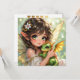 Anime fairy themed blank card. An adorable anime fairy holding her chibi baby dragon. Cute fairy with big green eyes and white flowers in her hair.