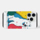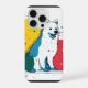 A dog with blue and white fur sits among colorful shapes and lines in an art-inspired design. The scene has vibrant colors and a playful vibe.