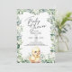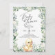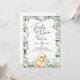 Belo convite para chás de fraldas com adorável pato bebê cercado por verde-aquarela e flores. Bonito roteiro escrito à mão para o Chá de fraldas é perfeito para este doce convite neutro de gênero. Coordenando de volta. Veja a coordenação de itens no nosso compro, Encantado Finch.