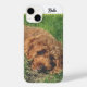 A phone case with a cute image of a Golden Doodle. The background, image and text can be personalized. Original artwork by W.B.