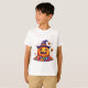 This adorable Halloween T-shirt features a smiling cartoon pumpkin wearing a purple witch hat with an orange buckle, sitting on a pile of colorful candies. Surrounded by cheerful jack-o’-lantern lollipops, stars, and dots, this design brings a fun and festive touch to any spooky celebration. Perfect for trick-or-treating, Halloween parties, or just showing off your seasonal spirit — a must-have for kids and candy lovers alike!
