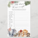 Apresentando o "Preço do Chá Safari Baby Boy é o Jogo Certo", um encantador aditamento a qualquer celebração de chá de fraldas. Esse jogo apresenta belas designs aquáticas de animais safari, incluindo elefante, tigre, leão, guaxinim e chimpanzé, belamente acentuados com folhas tropicais para um toque da natureza. Projetado para ser neutro em relação ao gênero, é perfeito para acolher um menino ou menina, fazer que todos sintam incluídos. Mergulhe na diversão com este jogo temático de safari, onde os hóspedes podem adivinhar o preço dos itens de bebês, criando momentos memoráveis no seu chá de fraldas.