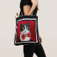 Tote all your Christmas stuff around with this adorable tuxedo cat holiday tote bag. The design features a photo of a tuxedo cat wearing a red bow tie. The design is edged in black and white. Copyright Peaches the Tuxedo Cat