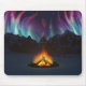 Em um vale coberto de neve em uma noite gelada no morto do inverno uma fogueira salta para cima para espelhar as luzes do norte enchendo o céu acima das montanhas distantes.