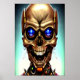 Crânio ciborgue de cor ouro com olhos azuis profundos. Esta é uma arte gerada por IA.