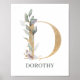 Florial da letra D monograma. A letra D, de textura castanha ouro, acentuada com folhas compostas de cor aquosa verde, flores e pó de ouro. Personalizado com o nome na fonte correspondente.