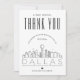 Um obrigado especial, seu cartão plano adaptado ao seu casamento na linda cidade de Dallas, Texas. Ele apresenta uma linha do horizonte estilizada da cidade na frente do cartão. No dentro é um ponto para sua própria mensagem exclusiva e uma foto opcional. Use as funções de personalização para alterar o filtro de fotos para cor e redimensioná-lo conforme necessário. Todos os elementos deste item estão desbloqueados e ajustáveis, por isso divirta-se a ser criativo!