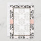 Convite em branco com um coração e costura de contraste com design de fita rosa e preta e uma borda floral de damasco preto e branco ligeiramente desgastada. Arte e design © Chrissy H. Studios, LLC. Todos os Direitos Reservados.