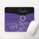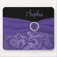 Esta vista elegante mousepad roxo e preto do damasco tem um broche de harmonização da fita e do cristal do falso. Personalize-a com seu próprio nome, monograma, ou o outro texto.