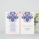 Elegante damask motif marinho blue, coral laranja, cerimônia de casamento e programa de festas. Um design de casamento moderno, mas clássico, com um talento retrô. Um delicado design de casamento com vintage sente-o, perfeito para um casamento de primavera ou verão contemporâneo ou tradicional. Você terá que dobrá-lo no centro. Escolha apenas este tipo de valor de papel à medida que ele se dobra bem.