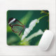 Uma borboleta de vidro se senta em silêncio em uma folha.