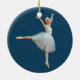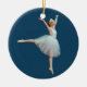 Esta bailarina pequena bonita no traje branco lindo está dançando em um fundo azul profundo. Faz um ornamento delicioso.