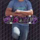 Impressão de safra tropical inspirada nas camisas de aloha dos anos 60 e anos setenta. Uma mistura colorida de transições cor-de-rosa e roxa através das flores de hibisco, do topo ao fundo do conselho, sobre um fundo de preto, cinza e branco. Personalizável para uma grande variedade de formas e tamanhos de conselho. Estas designs vêm em várias cores.