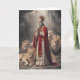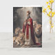 Daniel no cartão de saudação do leão... um barbudo Daniel em trajes reais, erguido com as mãos amarradas em oração. Ele veste uma coroa e um roupão com uma faixa vermelha. Ao seu redor estão quatro leões majestosos, com um leão deitado e os outros três em pé. O cenário parece ser uma caverna rochosa ou uma caverna com uma luz suave e difusa iluminando a cena.