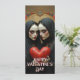 Mystical twin figures in flowing black veils cradle a weathered crimson heart, surrounded by ornate vintage flourishes and deep red roses. A dramatic Valentine design uniting romance, shadow, symmetry and timeless gothic elegance.