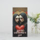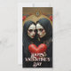 Mystical twin figures in flowing black veils cradle a weathered crimson heart, surrounded by ornate vintage flourishes and deep red roses. A dramatic Valentine design uniting romance, shadow, symmetry and timeless gothic elegance.