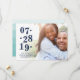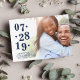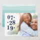 Os cartões salve a data de fotos em chic apresentam sua foto de noivado favorita, orientada para horizontal ou paisagem, com um gradiente branco no lado esquerdo, exibindo sua data de casamento em azul clássico de marinho com um alinhamento ímpar e ímpar para uma aparência moderna. Personalize com seus nomes, "salve a data" e a localização do casamento embaixo. Cartões invertidos para uma faixa de cor da água opcional em turquesa aqua.